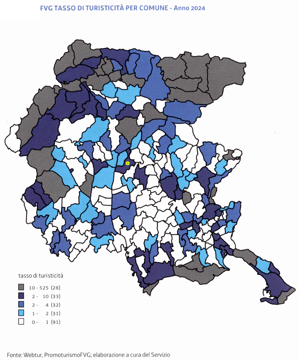 In particolare, come si rileva dalla mappa seguente, il territorio di San Daniele del Friuli (evidenziato col punto giallo/verde), insieme al limitrofo di Fagagna, sito a sud-est, è una zona ad alto tasso di frequentazione turistica, al pari di quello di altri importanti Comuni friulani quali Udine e Cividale.
